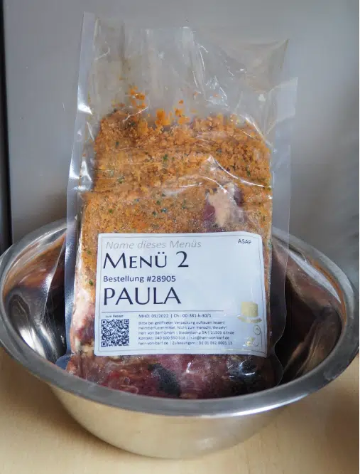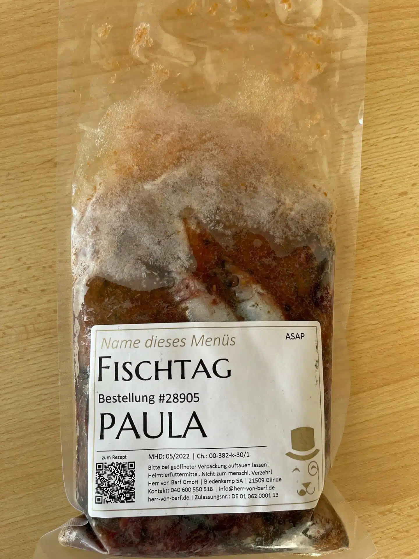 Wir bekommen 3 Menüs zum Abwechseln vorgeschlagen, mit jeweils unterschiedlich zusammengestellten Zutaten. Sie enthalten jedoch alle sowohl tierische als auch pflanzliche Bestandteile und Öle – jeweils für einen Tag optimiert. Paulas Fischtag ist damit einmal die Woche und statt Lachs gibt es Sprotten – wir lassen uns darauf ein und schicken unsere Bestellung ohne Veränderungen ab (Als Experte hätten wir das tun können – auch in den Größen der Fleischstücke zum Beispiel variieren). Die Angaben zur voraussichtlichen Lieferung notieren wir uns, damit wir die Tiefkühlware auch in Empfang nehmen und gleich wieder verstauen können.