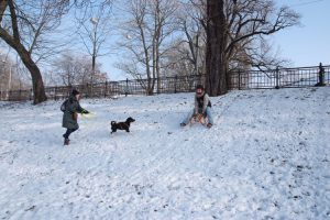Kerstin Jung stapft durch den Schnee im Park am Augsburger Roten Tor. Ihr zweijähriger Mischlingsrüde Buddy läuft an der lockeren Schleppleine voraus. Trainerin Krystana Föh gibt ihrer Helferin Hanna ein Handzeichen. Daraufhin rodelt diese mit einem Schlitten eine Böschung hinunter und kreuzt den Weg. Buddy sprintet in Richtung Schlitten und wirft sich ins Geschirr, bis die Schleppleine spannt. Kerstin hat Mühe, ihr kompaktes Kraftpaket zu halten.