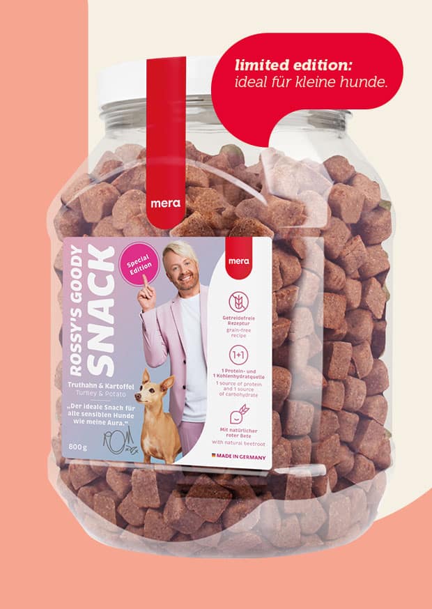 Exklusiv für mera hat TV-Star und Entertainer Ross Antony einen nahrhaften und gut verträglichen Hunde-Snack entwickelt – den „Rossy’s Goody Snack“ – ohne Zucker, Soja und Getreide sowie künstliche Farb-, Zusatz- und Aromastoffe.