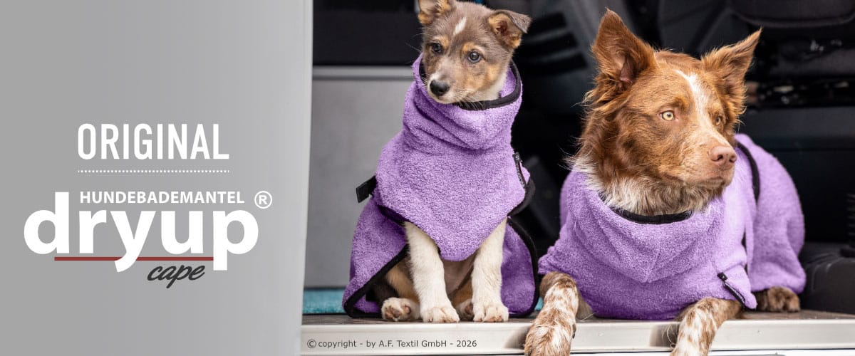 Mit dem original Hundebademantel DRYUP® CAPE aus 100 % Baumwolle (EU-Herstellung) trocknest du das Fell deines Hundes nach Regen, Dusche oder Schwimmen schnell und unkompliziert – ganz ohne Rubbeln.