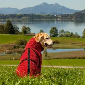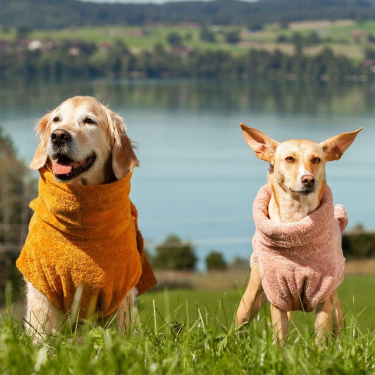 Wir zeigen dir hier zwei verschiedene: den Hundebademantel von Lill’s und den Zip.fit Dryup body von actionfactory. Beide saugen Feuchtigkeit auf und halten Schmutz zurück.