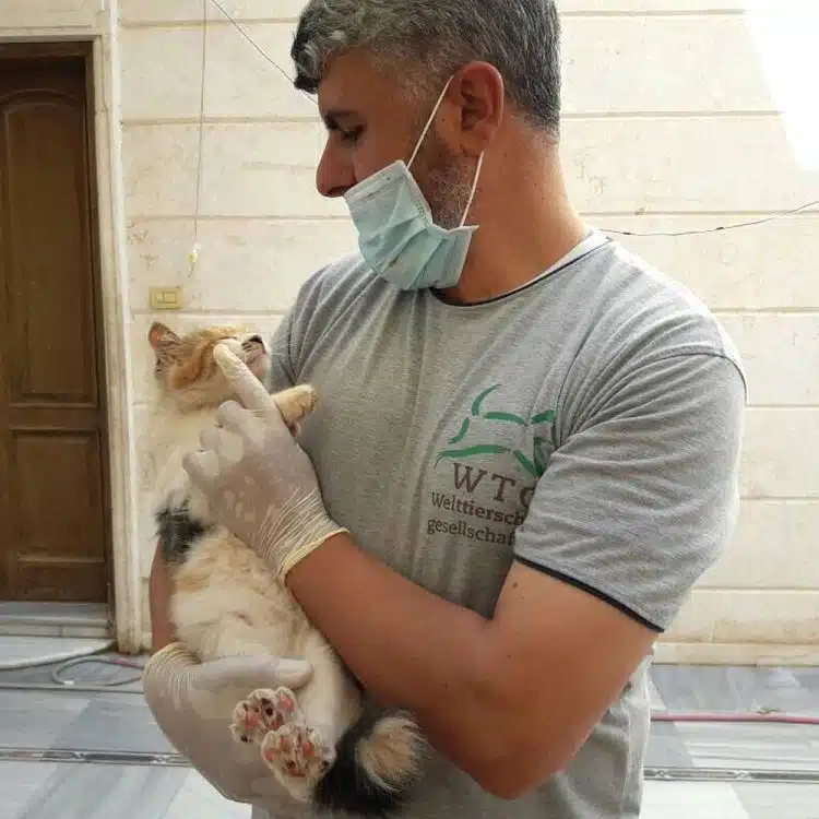 Der Tierarzt versorgt Wunden, verabreicht Mittel gegen Parasiten, impft und kastriert Tiere. Seine Einstellung ermöglichte die Welttierschutzgesellschaft (WTG) aus Berlin gemeinsam mit ihrer Partnerorganisation Il Gattaro d’Aleppo. Die WTG kommt für das Gehalt von Dr. Youssef sowie für die Kosten für die Medikamente auf.