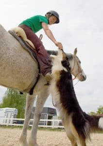 - Ist das Sichtfeld deines Pferdes eingeschränkt, etwa weil es auf einem Auge blind ist, kannst du das Training mit Hund anpassen. Eventuell kannst du deinem Hund ein Glöckchen umbinden. So lernt das Pferd, das Bimmeln mit dem Hund zu verbinden und erschrickt nicht, wenn sich dieser nähert.