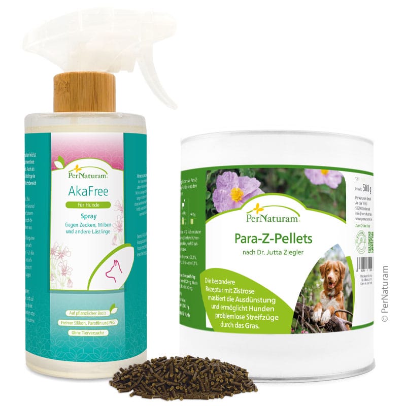 Frühling bedeutet Sonne im Gesicht, frische Luft und lange Spaziergänge mit deinem Hund. Doch diese Jahreszeit ist auch ideal für Zecken: Temperaturen über 10 Grad und ausreichend Feuchtigkeit bieten den kleinen Parasiten perfekte Bedingungen. Zecken sitzen oft an Grashalmen oder im Gebüsch und warten dort auf vorbeigehende Tiere. Ihren Wirt finden sie vor allem über Gerüche. Genau hier setzt unser Bundle aus AkaFree und Para-Z-Pellets an. AkaFree mit Geraniol wird äußerlich angewendet und kann Zecken, Milben und andere Lästlinge fernhalten. Du kannst es auch für Körbchen und Decken gegen Milben nutzen. Die Para-Z-Pellets nach Dr. Jutta Ziegler mit Zistrose und Bierhefe unterstützen deinen Hund von innen, indem sie seine Ausdünstung verändern, so wird er für Zecken weniger interessant. Die natürliche Kombination für entspannte Spaziergänge und unbeschwerte Frühlingsabenteuer. Das Beste für dein Tier!